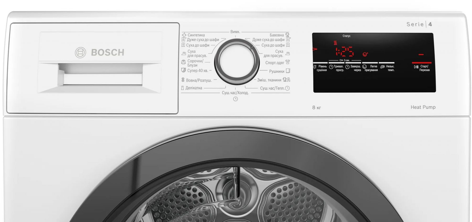 Програми:сушіння синтетики, сушіння білої та кольорової білизни, завершальне сушіння вовняних виробів, змішана білизна, програма за часом, рушники, сорочки/блузи, спортивний одяг, супер 40, тонкі тканини