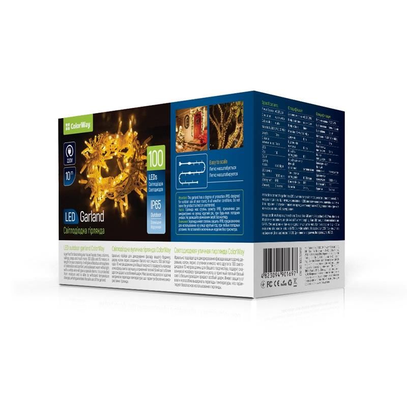 Світлодіодна вулична гірлянда СolorWay Ідеально підійде для декорування фасаду вашого будинку, дерев, колон, перил, сходинок і багато чого іншого. 100 світлодіодів і 10 метрів довжини для Вашої творчості, подарують казкову атмосферу свята і затишку, а приємне тепле біле світло в поєднанні з білим дротом додуть особливий шарм. Має захист від вологи і здатна витримати перепади температури, що гарантує безпечне використання гірлянди.