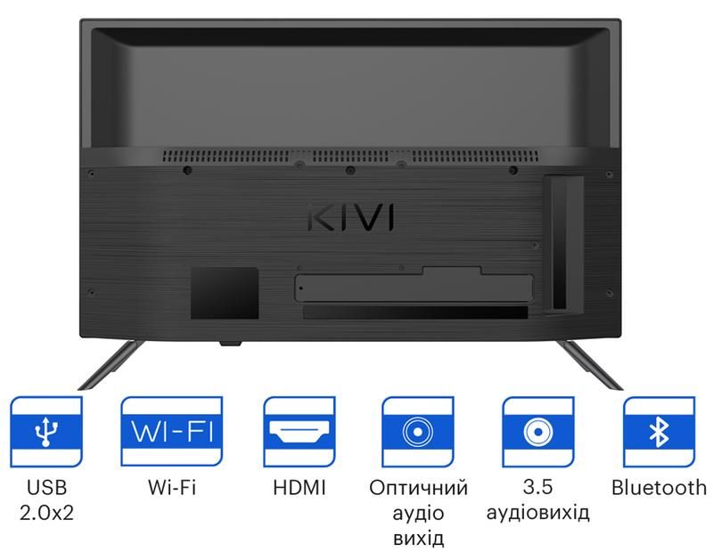 За допомогою панелі слотів ви зможете вивести на екран Kivi 24H750NW будь-яке зображення із зовнішніх носіїв та підключити додаткові аксесуари. Грайте, дивіться сімейний фотоархів, підключіть аудіосистему: все це є з роз'ємами стандартів 3.5 audio, USB 2.0, HDMI, оптичний аудіовхід. Підтримує бездротовий зв'язок WiFi та Bluetooth.
