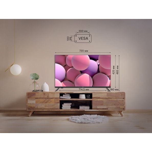 Безрамковий дизайн доповнений металевою підставкою у стилі Super Slim, яка підкреслює витонченість моделі та поєднує її з сучасним інтер'єром. Звук відтворюється через 2 динаміки потужністю по 8 Вт, реалізовано технологію просторового звучання Dolby Audio. Комфорт використання забезпечується високою якістю зображення, звуку, зручним інтерфейсом та ергономічним пультом дистанційного керування.