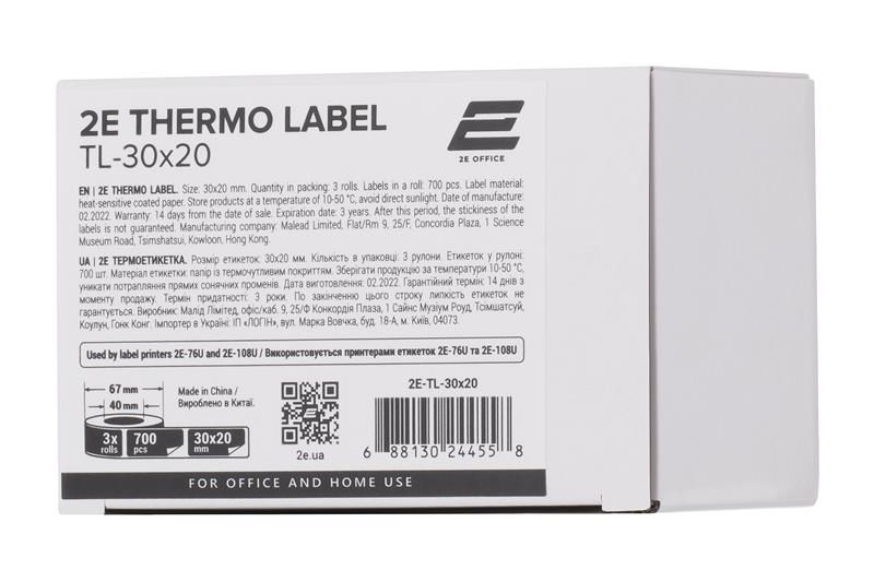 Термоетикетка 2E-TL-30X20 зі спеціального самоклейного паперу призначена для друку інформації на спеціальному термопринтері та спрощує процес маркування товару. Розмір 2E-TL-30X20 30 х 20 мм. В одному рулоні 700 етикеток (у комплекті 3 рулони).