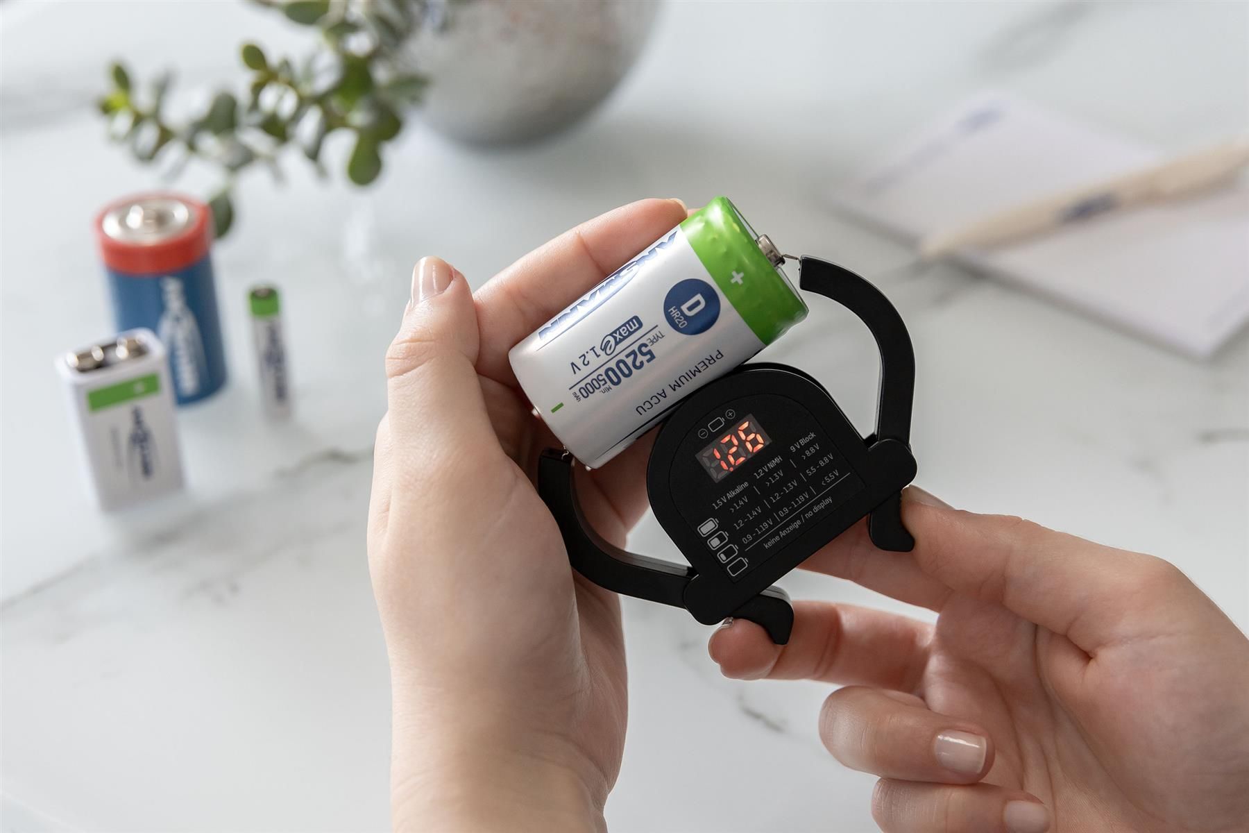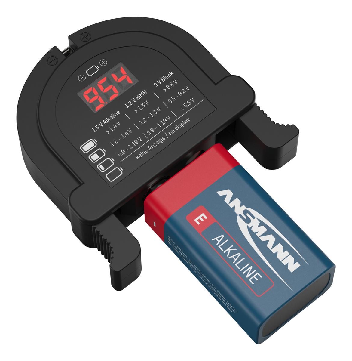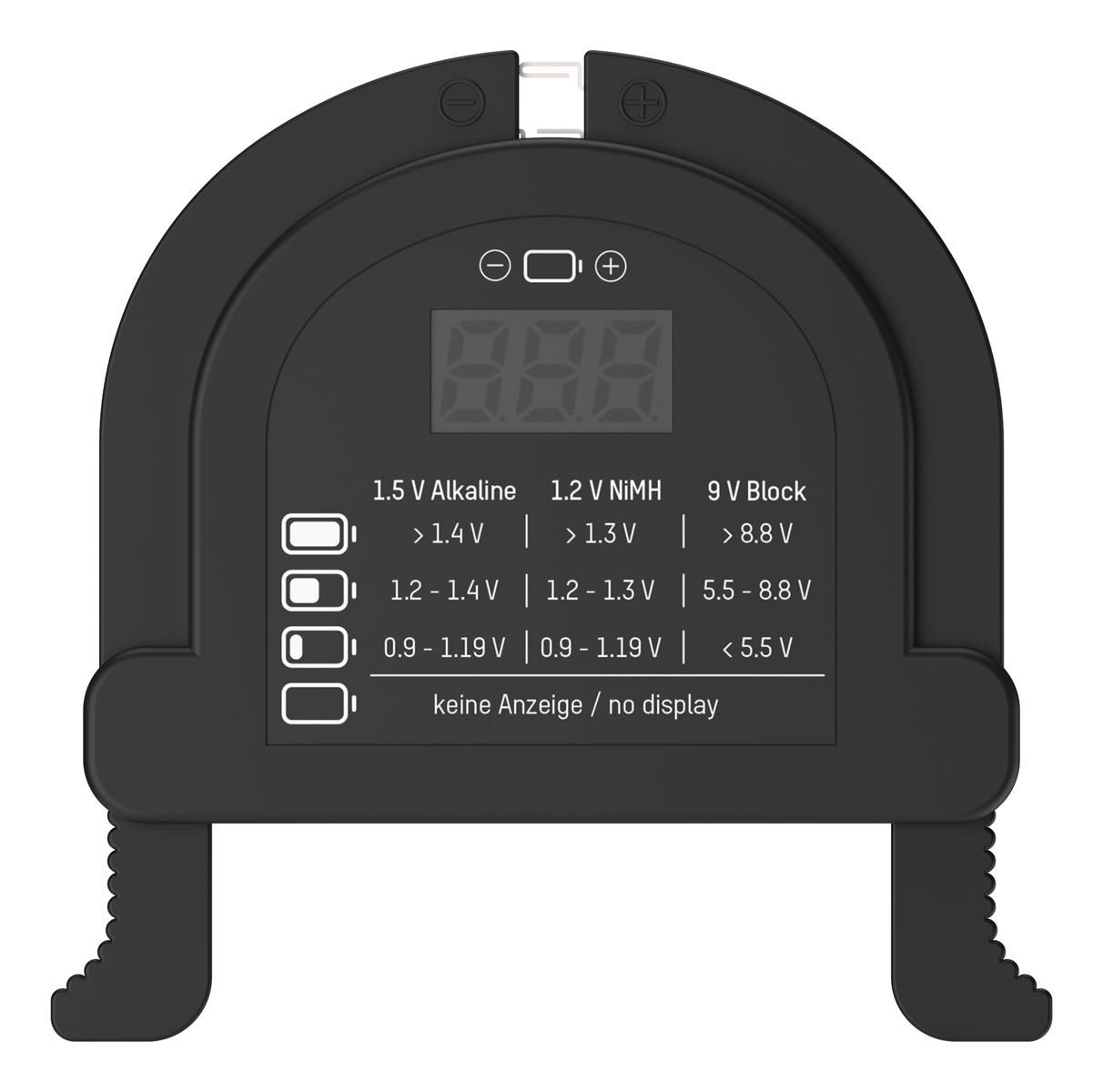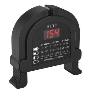 Він підходить для тестування лужних батарей 1,5 та NiMH батарей 1,2 В типорозмірів AAA, AA, C, D, а також для крон 9 В.