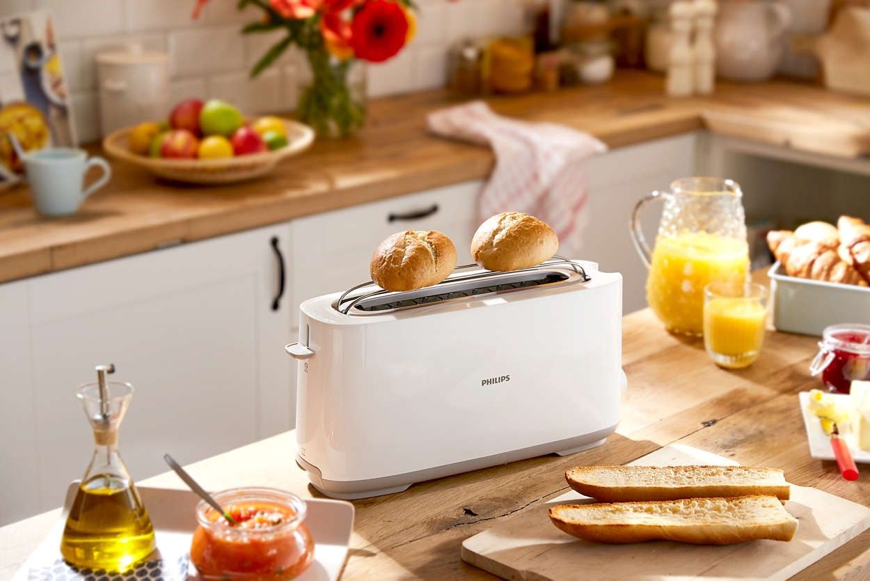 Тостер із довгим слотом і 8 налаштуваннями для рівномірного підсмажування до золотисто-коричневого кольору – незалежно від того, що саме ви підсмажуєте чи що вам подобається. Вбудована решітка для розігрівання булочок підходить для будь-чого – від булочок до круасанів.