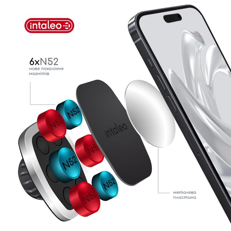 Компактний універсальний магнітний автотримач Intaleo CM05GG 6xN52 — зручно й безпечно кріпиться на решітку вентиляції передньої панелі авто з урахуванням оптимального кута нахилу. Достатньо просто прикласти пристрій до тримача.