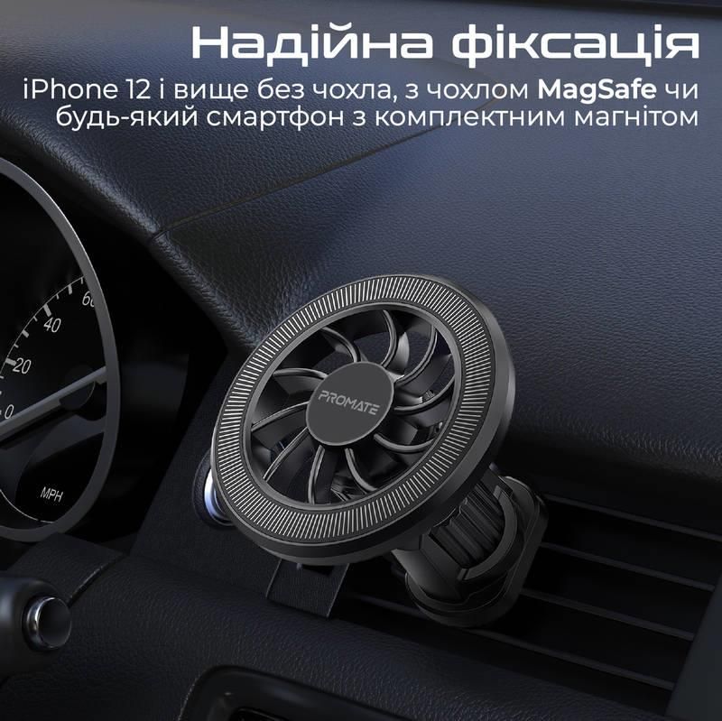 Promate Clipmount - автотримач із передовим дизайном у вигляді магнітного кільця. Надійна фіксація, універсальне кріплення та все це в компактному корпусі.