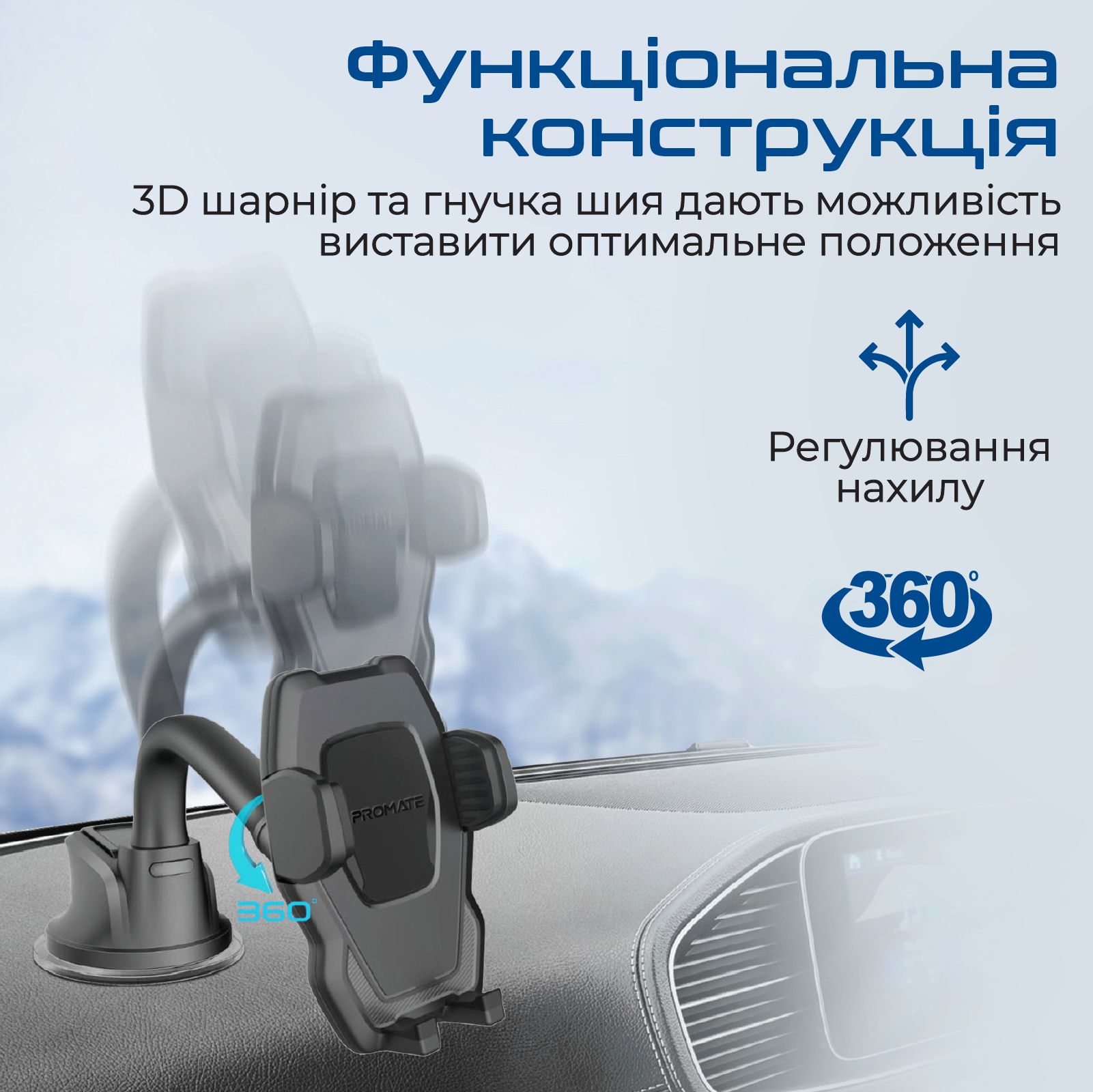 Promate DashMount - компактний та легкий автотримач на присосці, з механічними затискачами. Забезпечить надійну фіксацію будь-яких пристроїв з шириною від 5 до 9.5 сантиметрів.