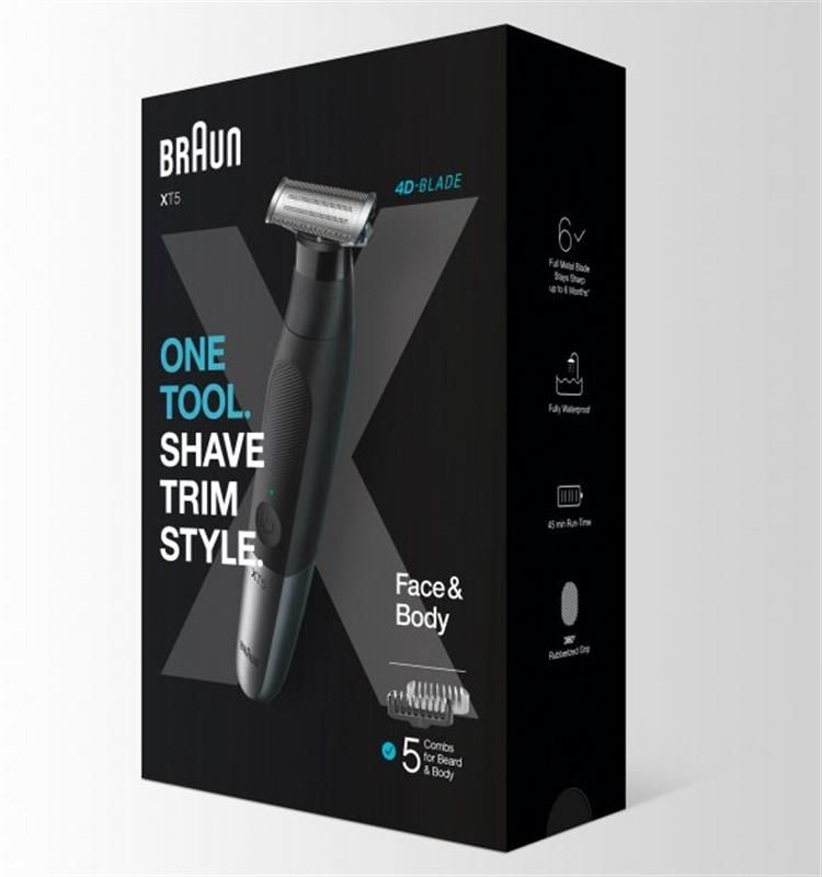 Благодаря двусторонней расческе можно подстригать как вверх, так и вниз, что делает движения легкими и быстрыми. На 100% водонепроницаемое, Braun Series XT5 можно использовать для стайлинга как угодно и где угодно: с помощью пены или геля, у раковины или в душе.