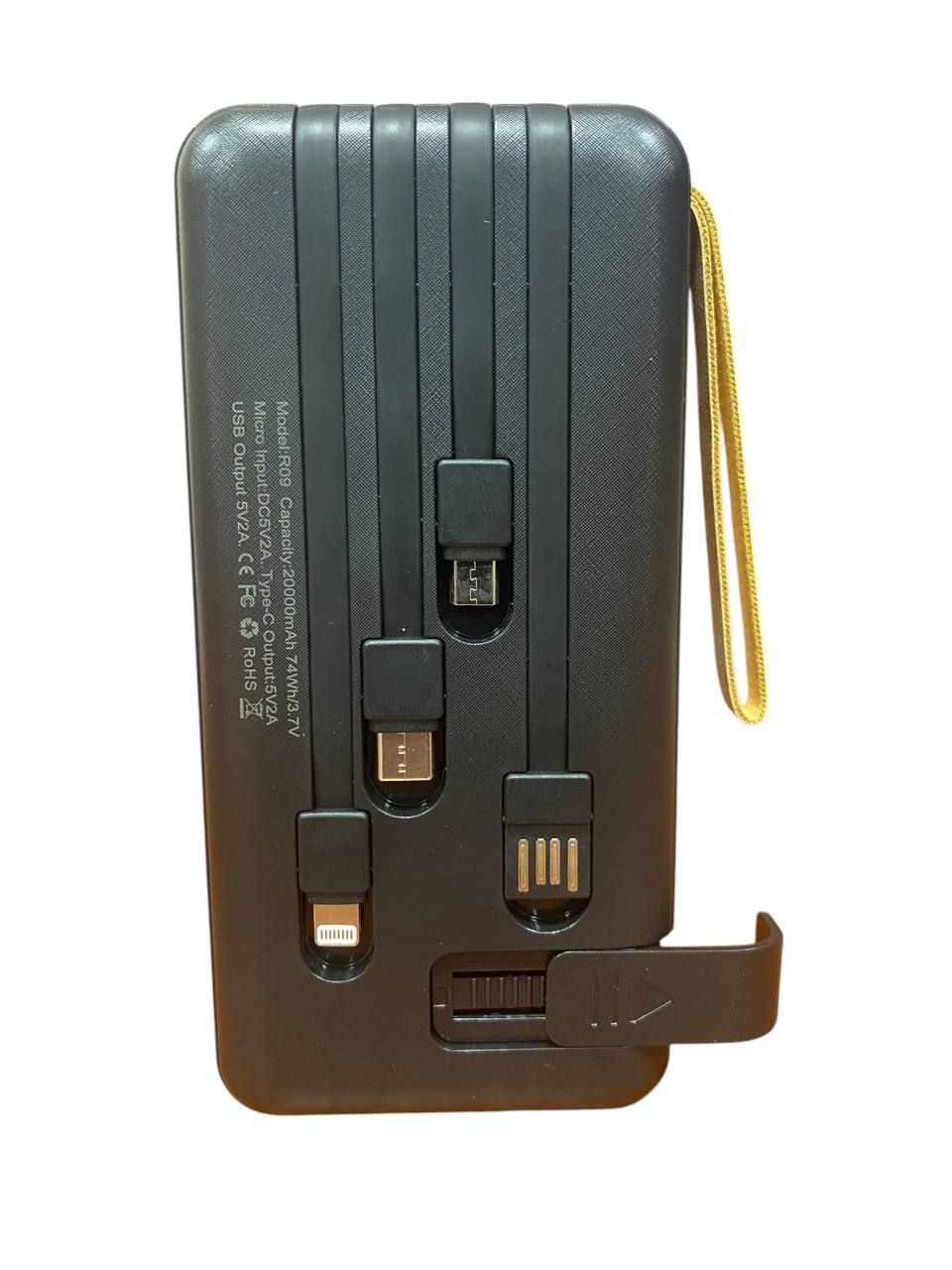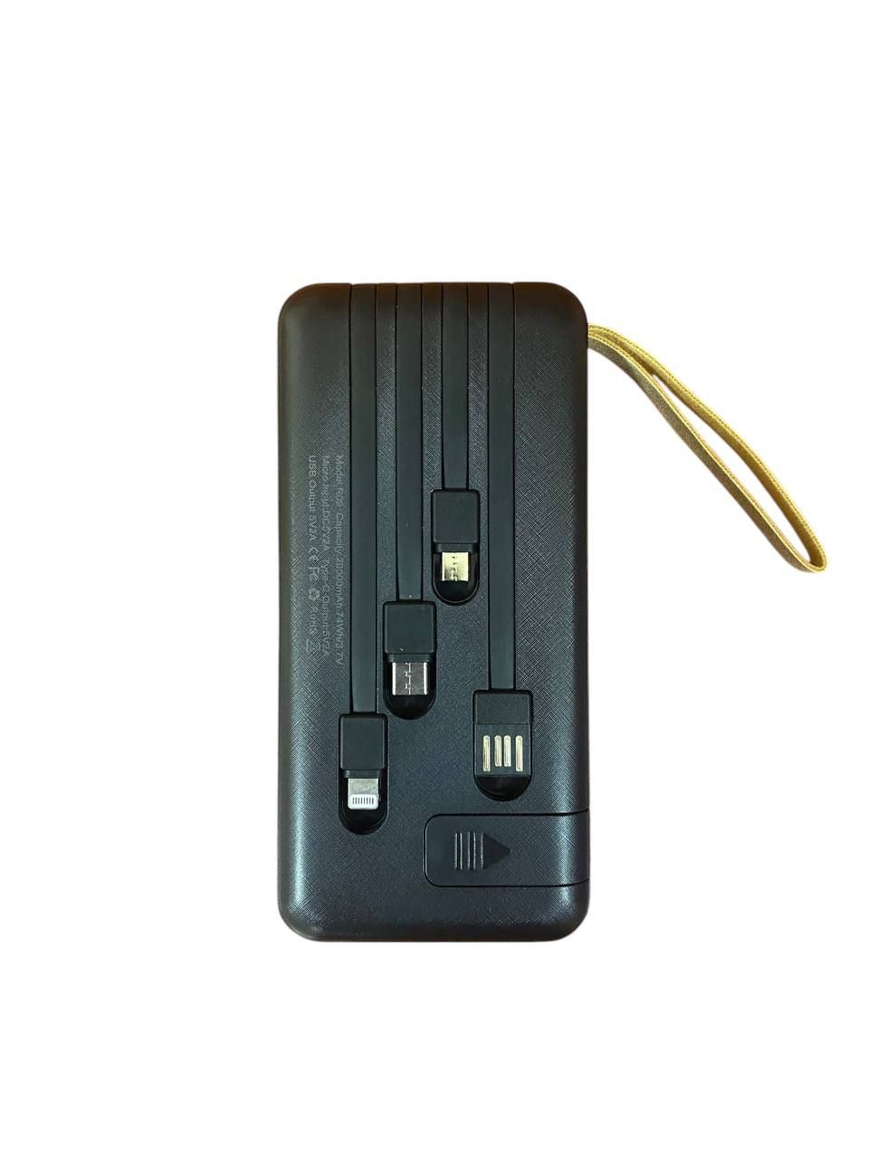 З тильного боку корпусу заховані короткі кабелі. Один із них з USB штекером призначений для заряджання самого пристрою, а решта – Lightning, micro-USB, Type-C для підзарядки телефону. Крім перерахованих інтерфейсів у power bank є вихідний USB, і вхідний USB Type-C, micro-USB.