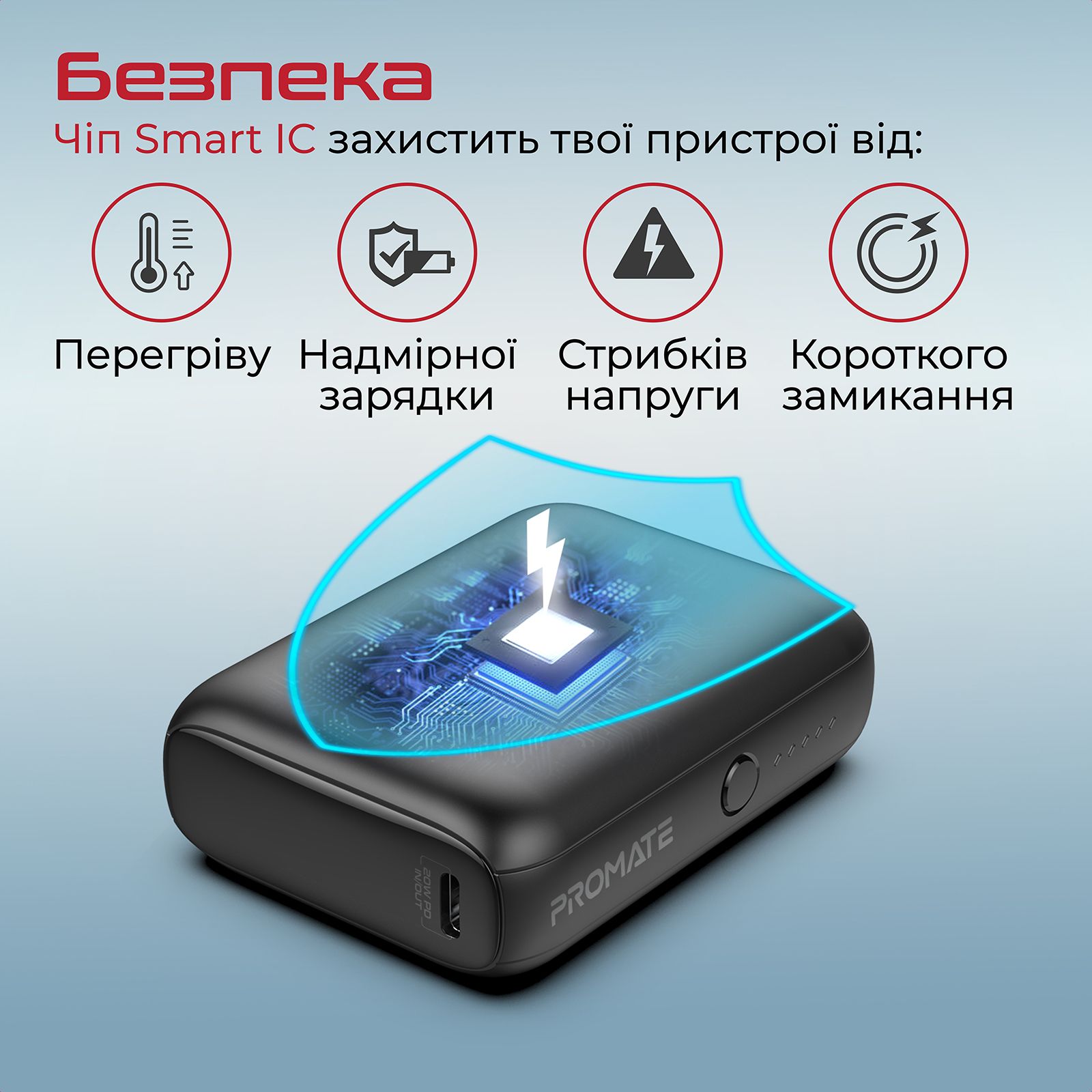 Безпека: Вбудований чіп Smart IC захищає повербанк і підключені до нього пристрої від перегріву, стрибків напруги, короткого замикання та надмірної зарядки.