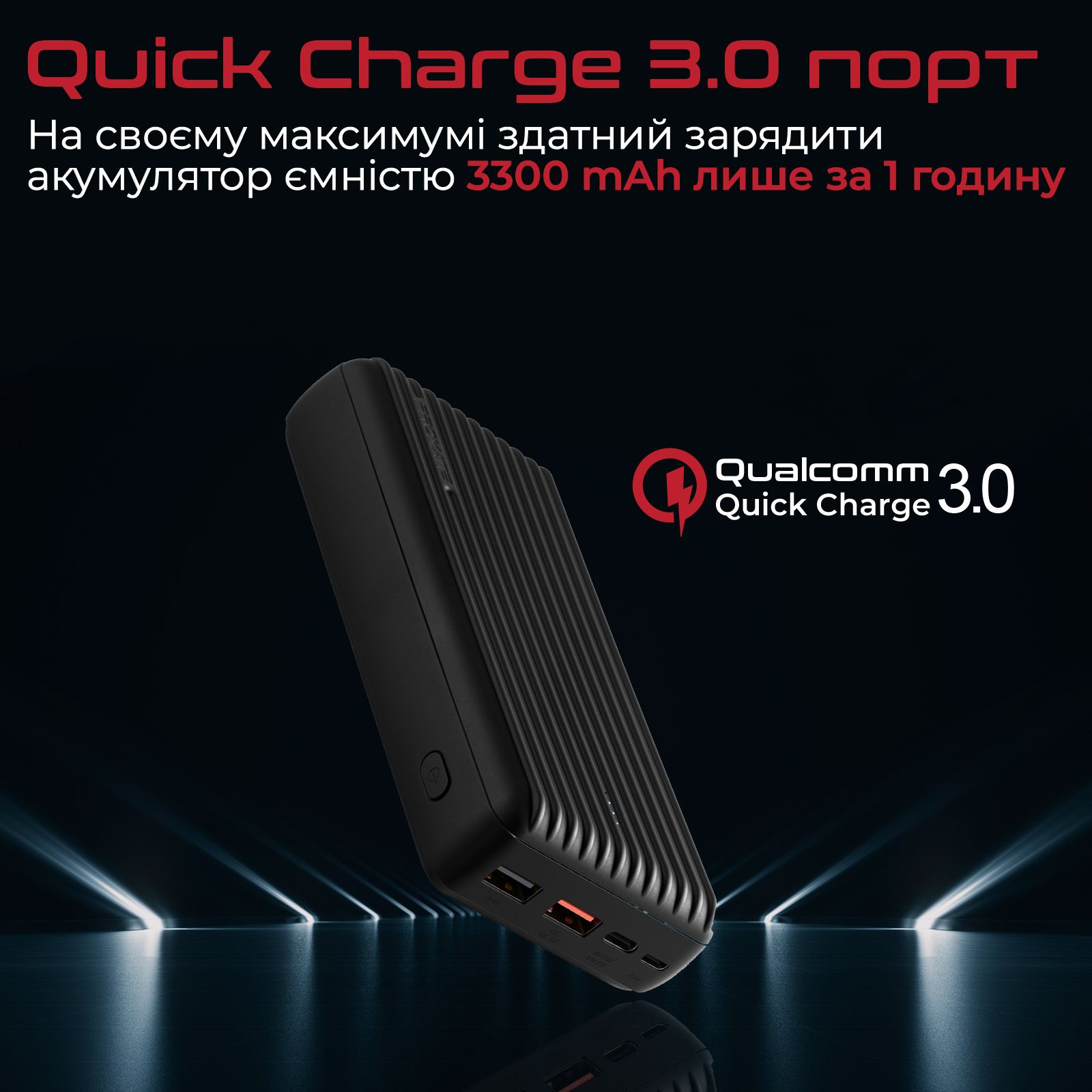 USB-A Quick Charge 3.0 порт: На своєму максимумі здатний зарядити акумулятор ємністю 3300 mAh лише за 1 годину. Працює у трьох режимах: 5В/3А, 9В/2А, 12В/1.5А (макс 18 Вт).
