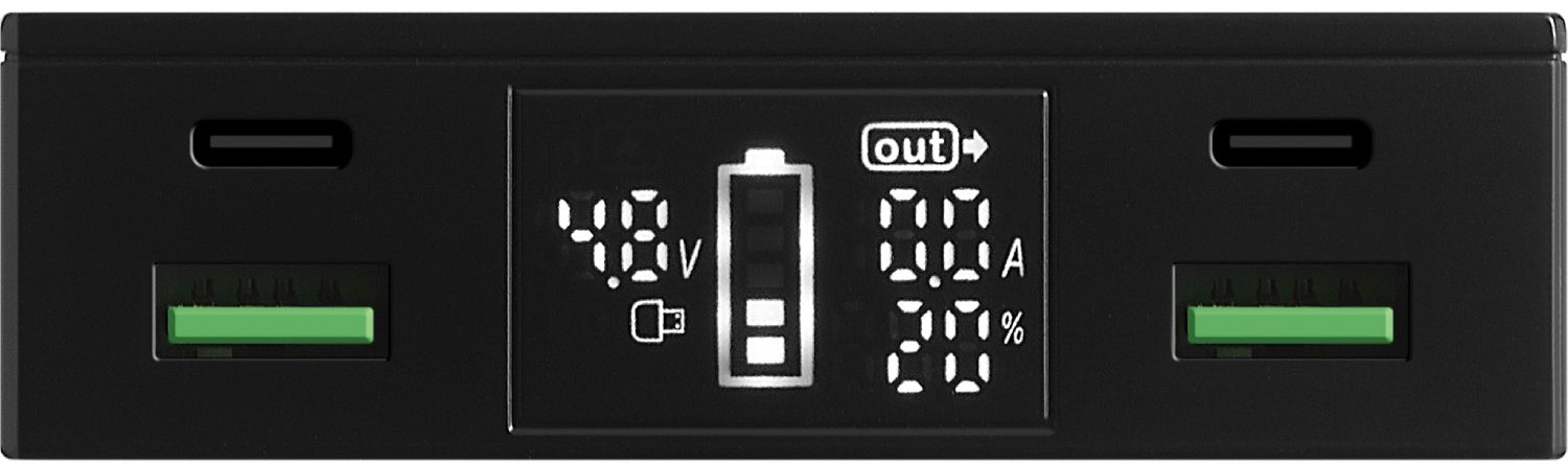 Цифровий дисплей передньої панелі забезпечує миттєвий огляд стану процесу заряджання та ємності акумулятора. Швидка зарядка повербанку менш як за 90 хв. Додаткова функція живлення через вхідну та вихідну потужність 100 Вт.
