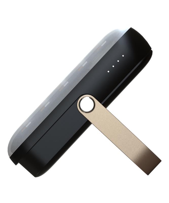 Sigma Mobile X-power SI10A9 має унікальний дизайн: квадратний корпус із приємною текстурою, великий ліхтарик згори та металеву ніжку, яку можна використовувати як підставку чи ручку для перенесення повербанка. На правому боці корпусу розміщена кнопка живлення, а на лівому 4 світлодіоди — це індикатори роботи й рівня заряду батареї.