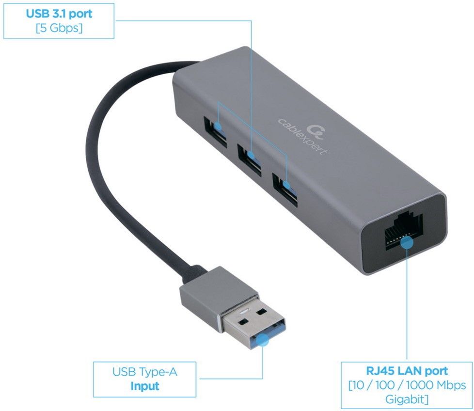 Адаптер із кабелем USB-A (тато) у локальну мережу з вбудованим USB хабом на 3 порти дає змогу під’єднувати пристрій з USB-A до дротової локальної мережі 10/100/1000 Мбіт/с.