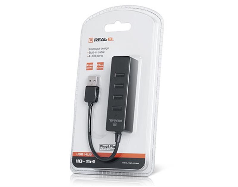 REAL-EL HQ-154 USB 2.0 HUB призначений для подовження та збільшення кількості USB портів з можливістю користування усіма одночасно. Може використовуватись з усіма пристроями, що мають можливість підключення за допомогою порту USB-А.
