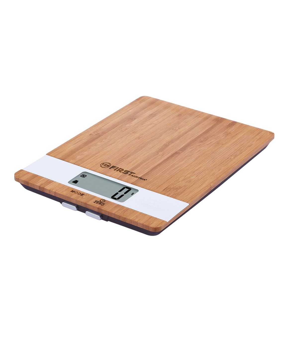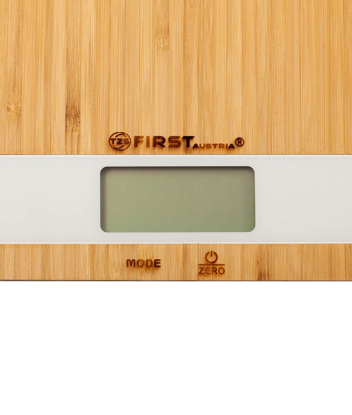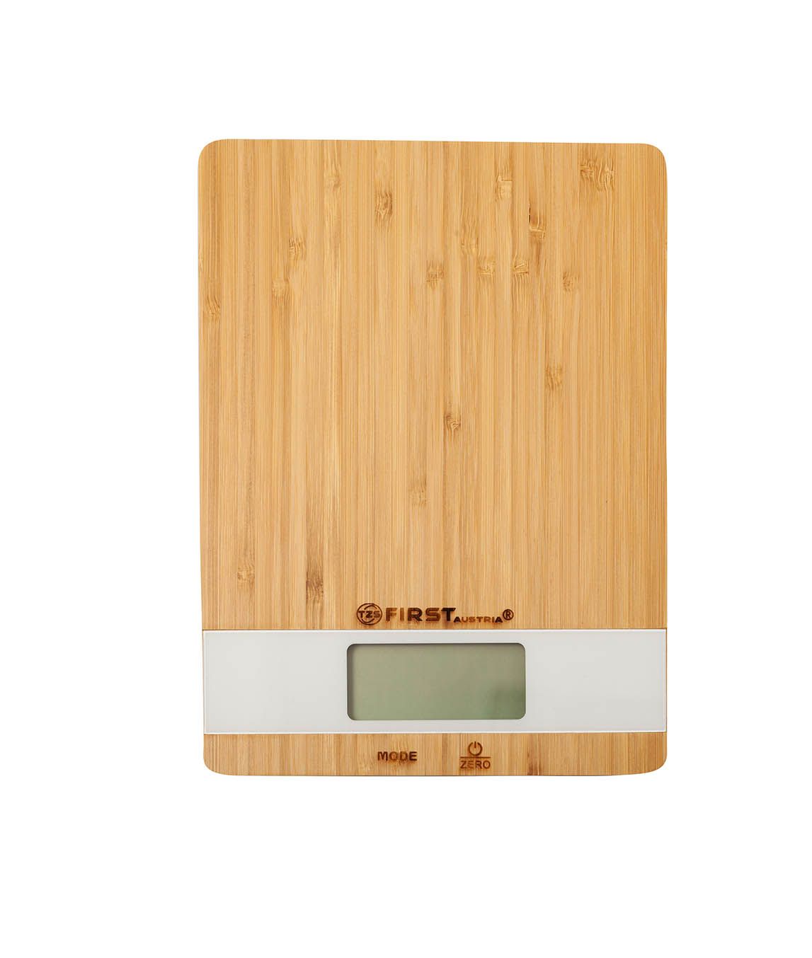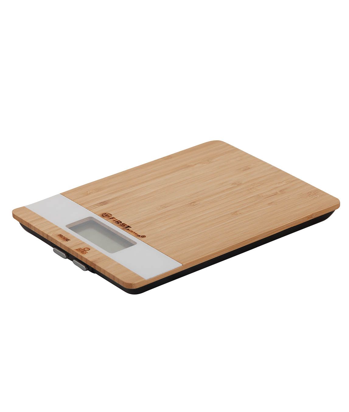 Ваги кухонні FIRST FA-6410 з максимальним навантаженням у 5 кг і кроком вимірювання 1 грам, оснащені плоскою дерев'яною бамбуковою платформою.