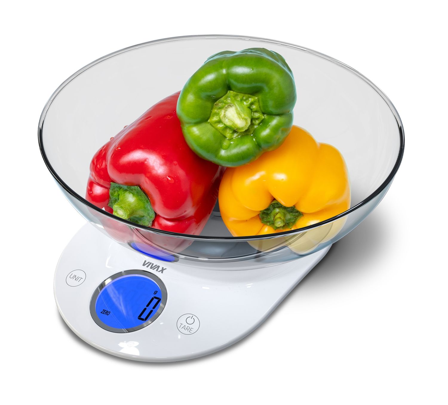 Точно виміряйте вагу продуктів за допомогою кухонної ваги VIVAX KS-505BW. Завдяки нейтральному дизайну та зовнішньому вигляду ці ваги ідеально підходять для сучасних кухонь. Вага чітко відображається на синьому РК-екрані, а також є додатковий пластиковий контейнер для вимірювання ваги, який допоможе вам при приготуванні десертів і тортів.