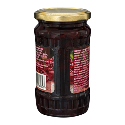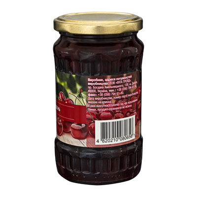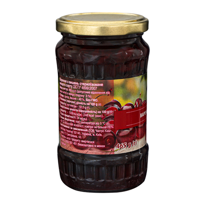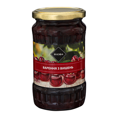 Варення Rioba з вишень стерилізоване 465г. Склад: цукор, вишня - 40%. Поживна (харчова) цінність на 100г продукту: вуглеводи - 62г. Енергетична цінність на 100г продукту: 1039кДж/248ккал. Умови зберігання: при температурі від 0°С до +25°C i відносній вологості повітря не більше 75%. Строк придатності: 24 місяці. Країна виробник: Україна. Маса нетто: 465г.