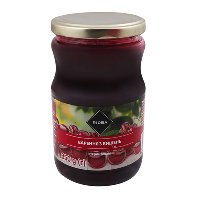 Варення Rioba з вишень стерилізоване 850г. Склад: цукор, вишня без кісточки - 40%. Поживна (харчова) цінність на 100г продукту: білки - 0.44г, жири - 0.01г, вуглеводи - 69г. Енергетична цінність на 100г продукту: 1173кДж/280ккал. Умови зберігання: при температурі від 0°С до +25°C та відносній вологості повітря не більше 75%. Строк придатності: 24 місяці. Країна виробник: Україна. Маса нетто: 850г.