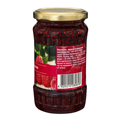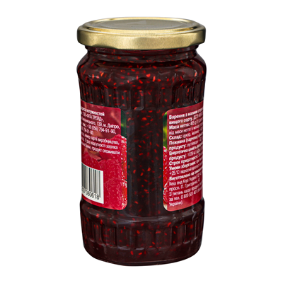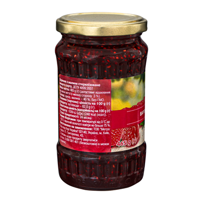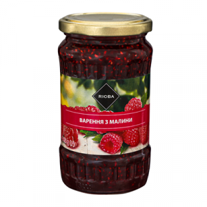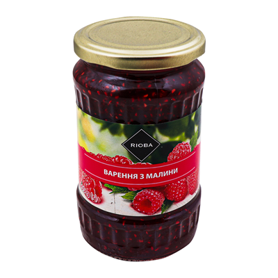 Варення Rioba з малини стерилізоване 465г. Склад: цукор, малина - 40%. Поживна (харчова) цінність на 100г продукту: вуглеводи - 62г. Енергетична цінність на 100г продукту: 1039кДж/248ккал. Умови зберігання: при температурі від 0°С до +25°C i відносній вологості повітря не більше 75%. Строк придатності: 24 місяці. Країна виробник: Україна. Маса нетто: 465г.
