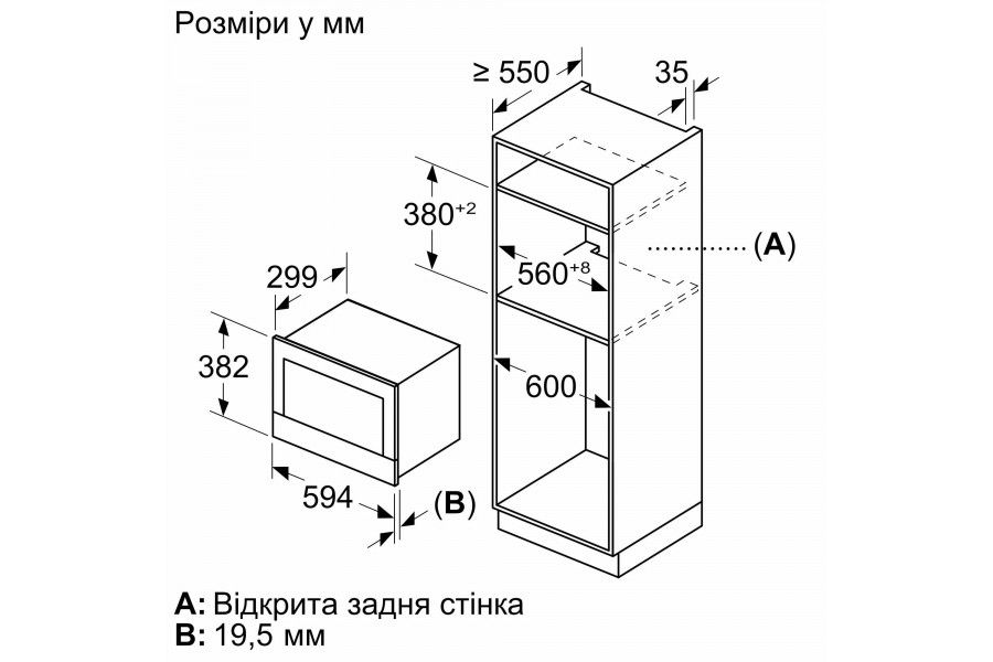 Габарити ніші для вбудовування:560-568 х 362-382 х 300 мм