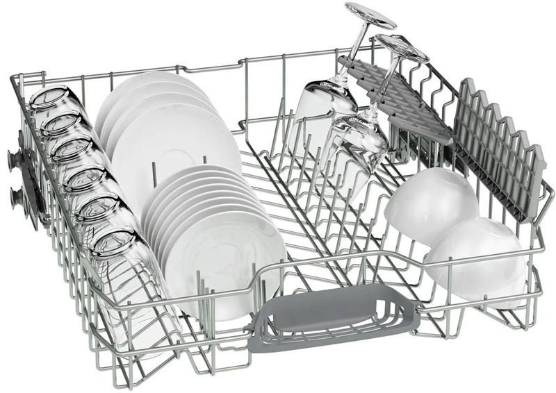 Місткий верхній короб можна регулювати за висотою загалом на 5 см між трьома положеннями простим рухом руки - завдяки системі Rackmatic. Тарілки для піци або фужери на високій ніжці - ця система дає змогу дуже гнучко створити додаткове місце для високих предметів посуду у верхньому або нижньому коробі.