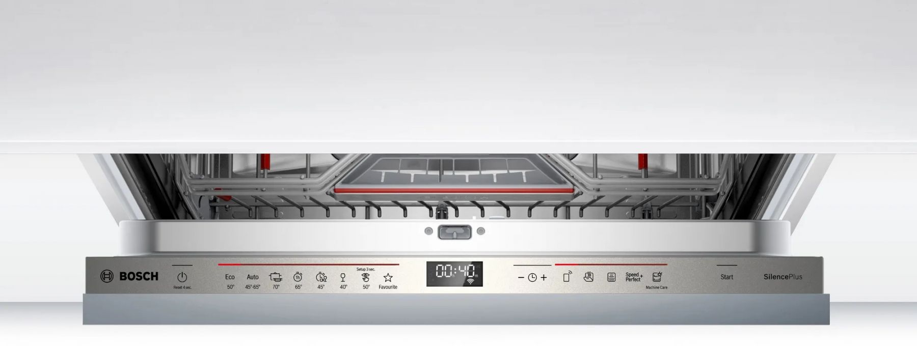 Вбудована посудомийна машина Bosch SMV6ECX50K шириною 60 см розрахована на 13 комплектів посуду. Девайс оснащений 8 програмами: "Інтенсивна 70 °C", "Автоматична 45-65 °C", "Економічна 50 °C", "Тиха 50 °C", "1год 65 °C", "Скло 40 °C", "Швидка 45 °C ", "Улюблена" і 4 спеціальними функціями: Remote Start, VarioSpeed ??Plus, HygienePlus, ExtraDry. Рівень шуму програми "Тиха 50 °C": 41 дБ, а клас енергоефективності - A+++.