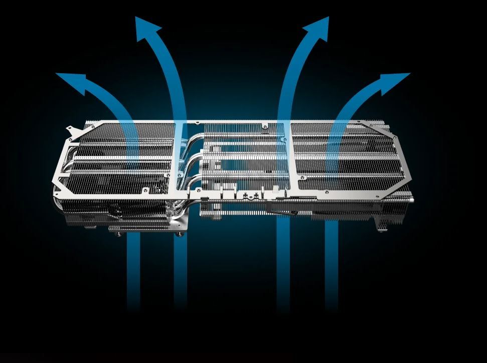 Ефективна теплопровідність у будь-який час. Велика гладка нікельована мідна основа, що покриває графічний процесор і пам'ять, здатна швидко поглинати і рівномірно розсіювати тепло. Забезпечує ефективне охолодження навіть під час роботи на високих швидкостях.