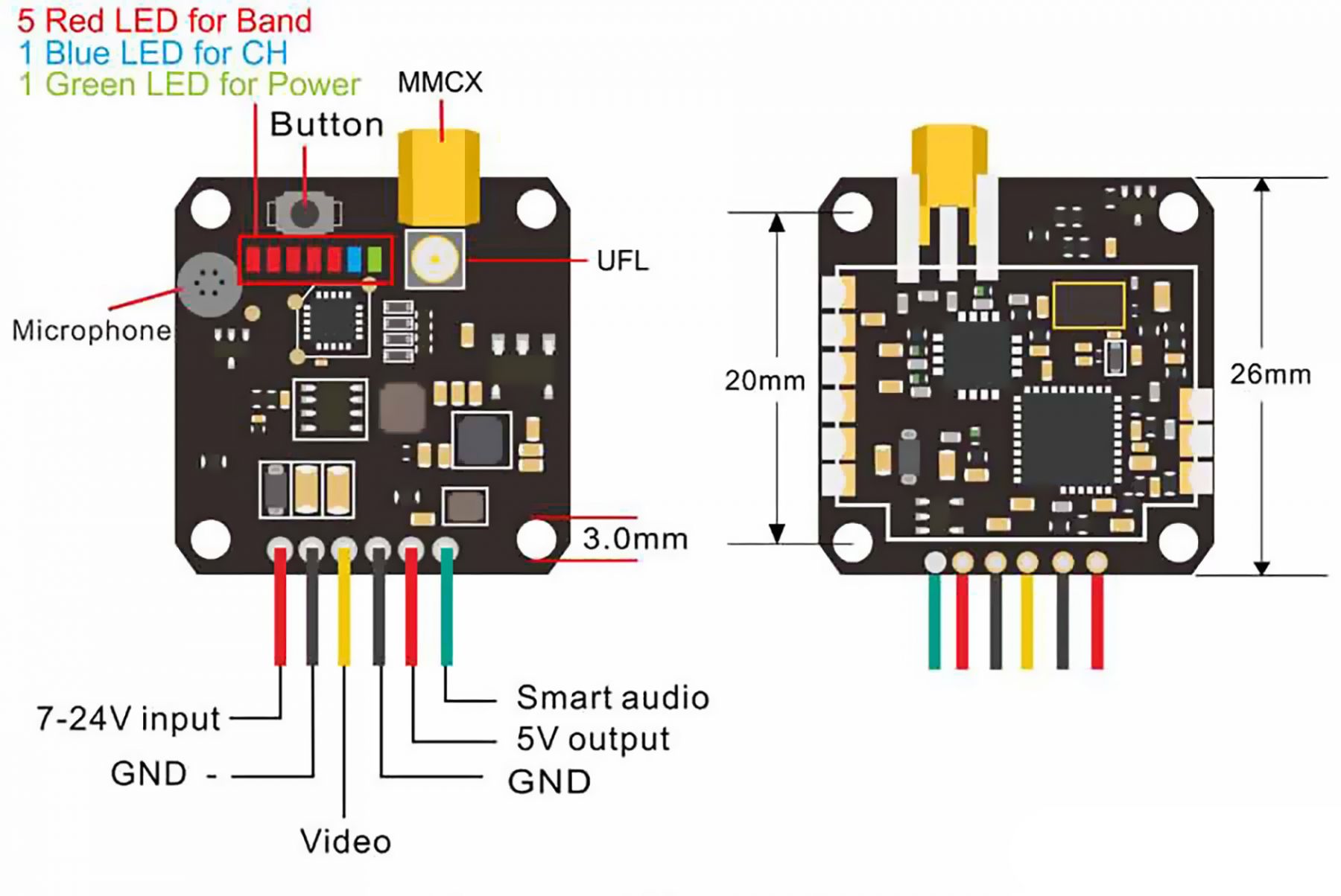 AKK FX3-Ultimate-DVR - це версія відео передавача AKK FX3-ultimate, але зі збільшеною потужністю до 1000mW і додатковим DVR модулем, через що розмір плати збільшився до 30.5 х 30.5мм, але монтажна схема залишилася як і раніше 20 х 2. Також прибрано U.FL вихід антени, тепер на платі є тільки MMCX вихід. DVR модуль має власну кнопку керування та LED індикацію.