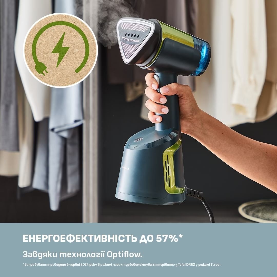 Три режими роботи — лише пара, м’яке всмоктування та турбо — підходять для всіх типів тканин: від найделікатніших до щільної бавовни. AeroSteam на 50% швидший за звичайні ручні відпарювачі та дозволяє зекономити до 57% електроенергії.