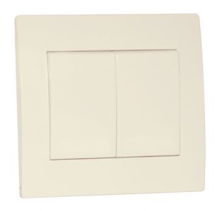 Вимикач подвійний у двох кольорах. Основа з оцинкованої сталі. Мідні контакти зі срібним покриттям. Можливість управління двома джерелами світла. Матеріал корпусу – негорючий PC-пластик.