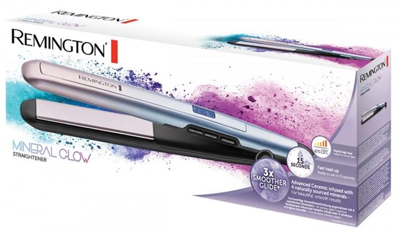 Випрямляч Remington Mineral Glow S5408 виконаний у приголомшливому градієнті від синього до бузкового і дає змогу без зусиль вирівнювати волосся або створювати легкі хвилі. Пластини приладу оснащені вдосконаленим керамічним покриттям, з додаванням чотирьох натуральних мінералів - кварцу, турмаліну, опалу і місячного каменю.
