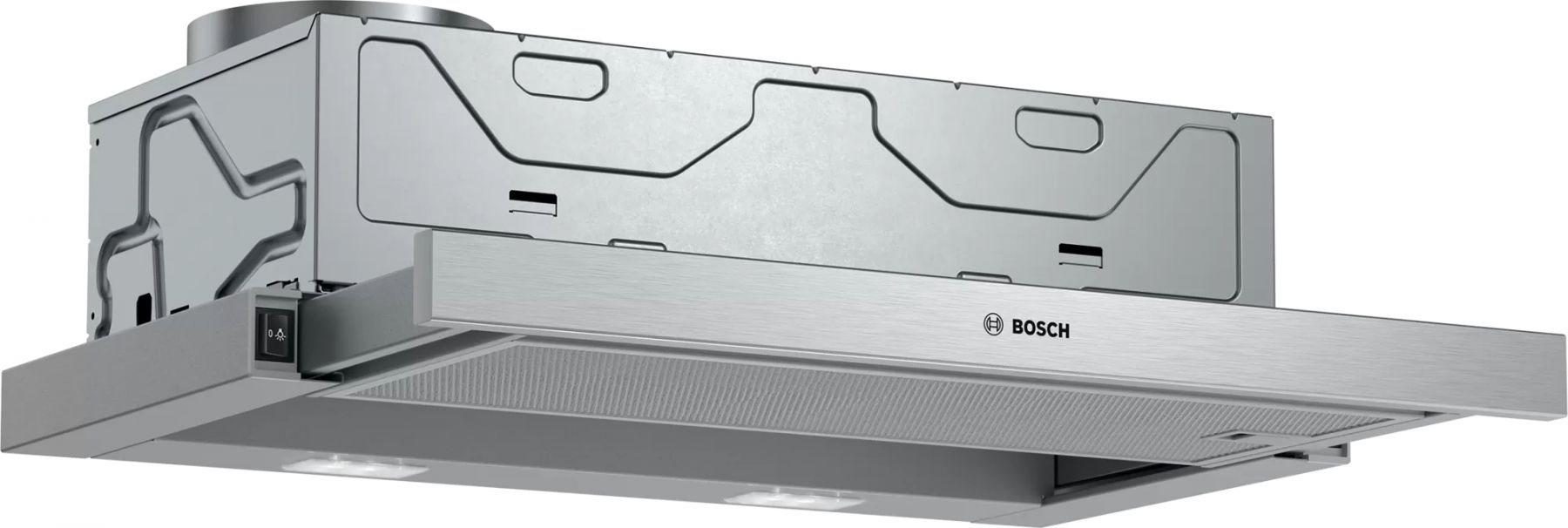 Для видалення запаху приготувань на кухні використовують витяжки, варіантів дуже багато, але особливої популярності набули вбудовані в короб меблі. Модель Bosch DFM064W54 дає вам можливість легко та якісно фільтрувати на кухні повітря від неприємних запахів і випарів під час приготування. Монтується в готовий ящик кухонних меблів, спеціальних пристроїв не потрібно. Потужний двигун здатний очистити 388 куб/год площі приміщення. Висувний екран можна обладнати декоративною панеллю під колір вашої кухні або металу, додатково купується.