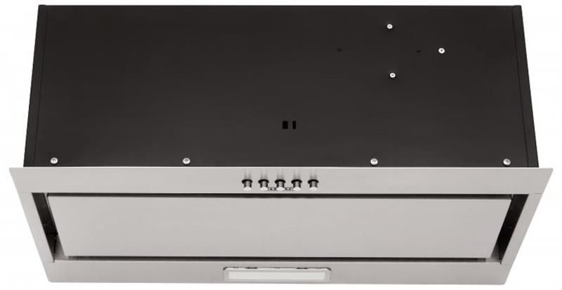 Витяжка повністю вбудовується у звичайну кухонну шафку шириною 60 см. Видимою залишається тільки передня панель з нержавіючої сталі, стійка до вологи та високих температур. Лаконічний дизайн витяжки гармонійно поєднується з кухнею та в стилі мінімалізм, хай-тек чи модерн.
