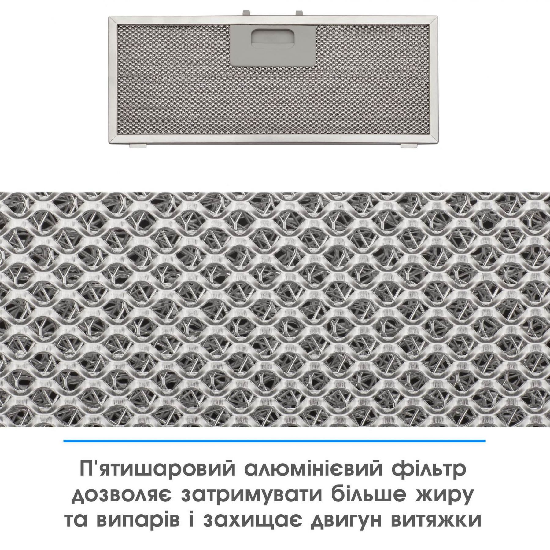 Надійний 5-шаровий алюмінієвий фільтр поглинає жир, бруд, дрібні сторонні частинки та захищає двигун витяжки. Для легкого очищення достатньо вийняти та помити в гарячій воді або посудомийній машині.