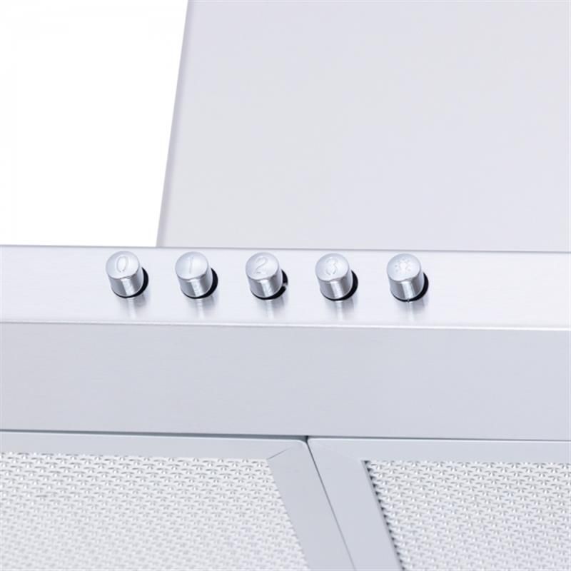Мініатюрна витяжка, одномоторна, потужність: 700 м3/год. Ширина: 595 мм. Колір нержавіюча сталь. Управління механічне. 3 швидкості. Освітлення: 1 x 2 Вт LED. Алюмінієвий фільтр. Режими роботи: Відвід/рециркуляція. Рівень шуму: 52-61 Дб.