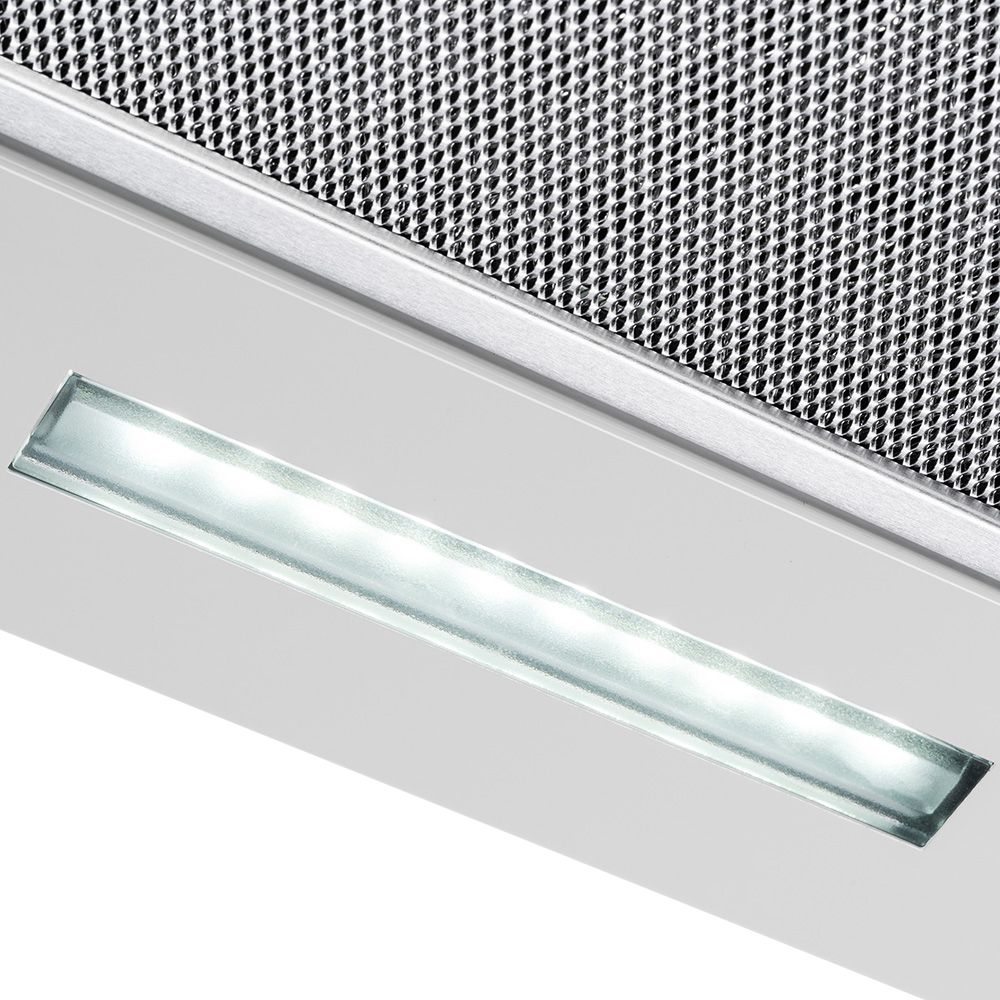 Непомітний помічник на кухні сподобається любителям мінімалізму. Витяжка повністю вбудовується в шафу й ідеально підходить для невеликих кухонь. Продуктивність 650 м3/год – цього достатньо для кухні 13-14 м2. LED-освітлення забезпечує комфортне приготування страв навіть у темний час доби. Ергономічне механічне керування дозволяє доволі легко змінювати швидкості. Витяжка може працювати в двох режимах на вибір - відведення повітря або рециркуляція. Витяжки доступні в двох варіантах завширшки - 50 та 60 см.