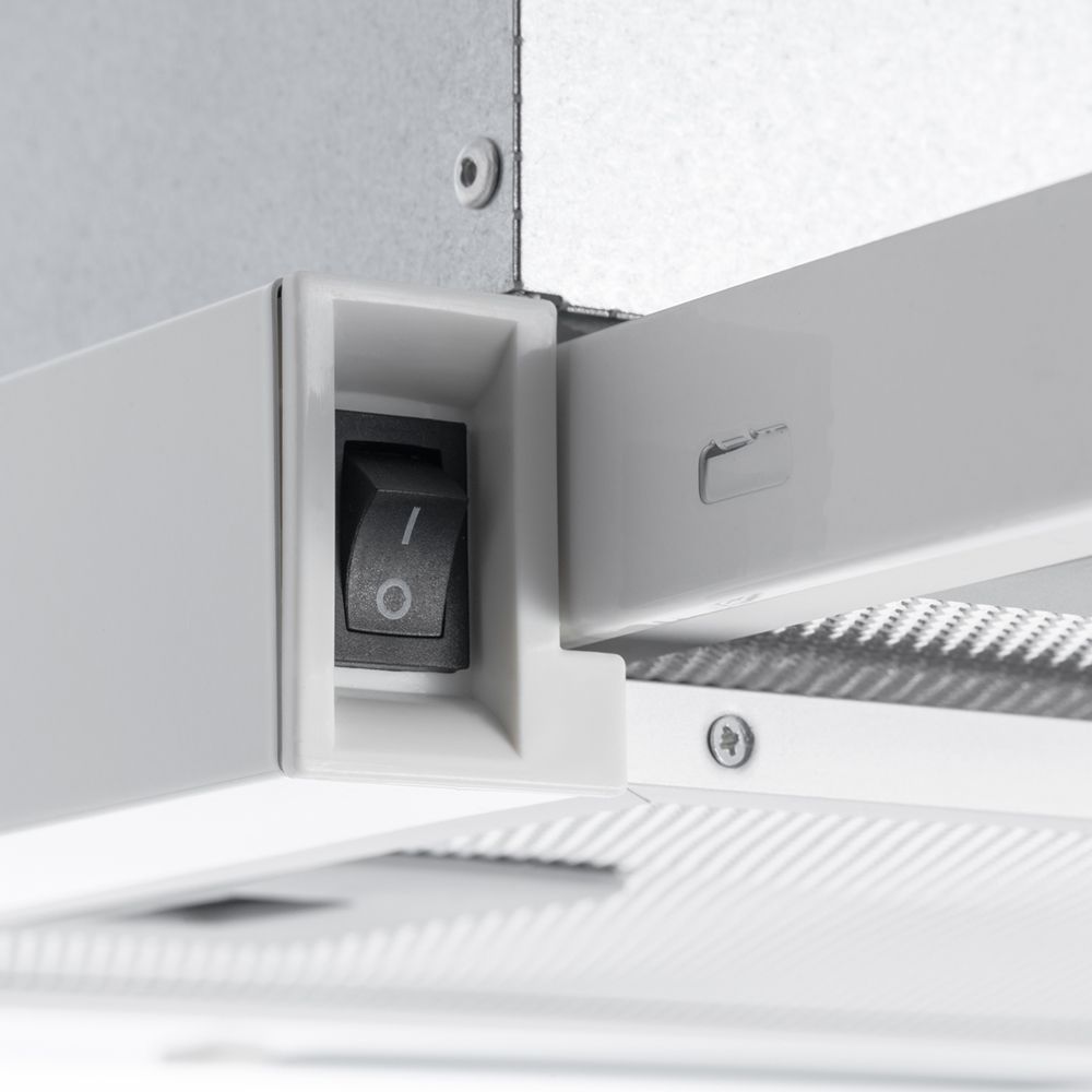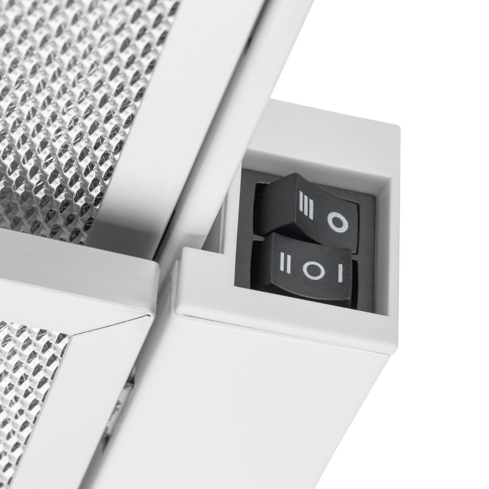 Висувна панель з другим жировим фільтром збільшує площу забору повітря і полегшує управління витяжкою. Кнопки включення двох швидкісних режимів і освітлення розташовані по обидва боки від висувної панелі.