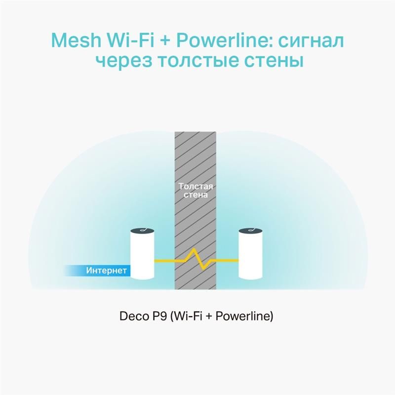 Deco P9 поєднує в собі дводіапазонний Wi-Fi і Powerline. Технологія Powerline використовує електропроводку вашого будинку для більш стабільного з’єднання між пристроями Deco, долаючи стіни і інші перешкоди, що дозволяє збільшити швидкість мережі і отримати безшовне покриття.