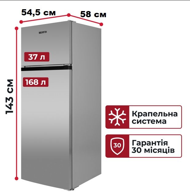 Холодильник виробництва компанії Grifon просто незамінний у побуті та стане прикрасою будь-якого інтер'єру. Настільний тип холодильника дуже зручний у використанні і в основному служить для зберігання невеликої кількості продуктів. Можна використовувати як додатковий до основного холодильника. Це зрозуміло за розмірами. Його висота в 1430 мм, при ширині в 545 мм і глибині 580 мм забезпечує загальний обсяг пристрою - 205 л.
