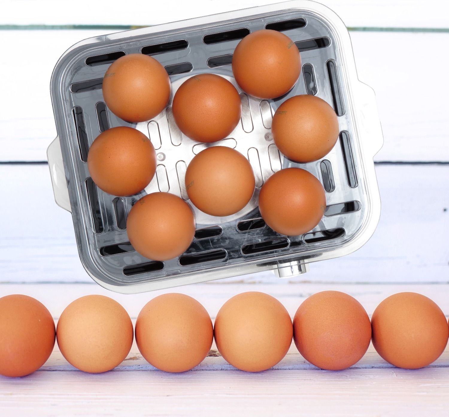 У яйцеварці можна готувати до 8 яєць одночасно. Готовність яєць залежить кількості води. Ніколи не пропустіть час приготування! Виконайте кілька отворів у яйцях за допомогою голки для яєць, щоб вони не лопнули під час приготування. Помістіть яйця на лоток для яєць і додайте необхідну кількість води за допомогою мірного стаканчика, щоб додати яйця круто, некруто або напівготові. Після приготування яйця можна зберігати у теплі до моменту вживання. З метою безпеки ставте яйцеварку на рівну суху поверхню. Підключіть шнур живлення до заземленої розетки. Індикатор загориться, сигналізуючи про увімкнення приладу.