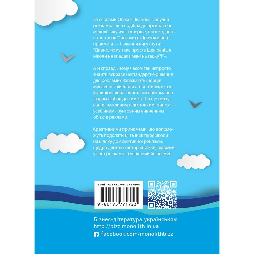 Реклама — рушій прогресу і запорука продажів. Вона оточує нас зусібіч. Часом викликає нестримний захват, нерідко дратує, а іноді залишає цілком байдужими. Подеколи здається, що всі яскраві ідеї уже вичерпано і придумати щось нове у цій сфері просто неможливо. Але книжка Олексія Іванова розбиває цей стереотип (як і багато інших) і відкриває перед рекламістами широкі перспективи.
