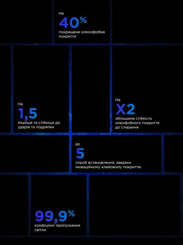 Поліпшена клейова основа дозволить зробити установку легко без повітряних бульбашок, а також дає можливість повторити установку до 15 разів за потреби. Anti-static effect зменшує ймовірність влучення сміття в 4 рази при встановленні.