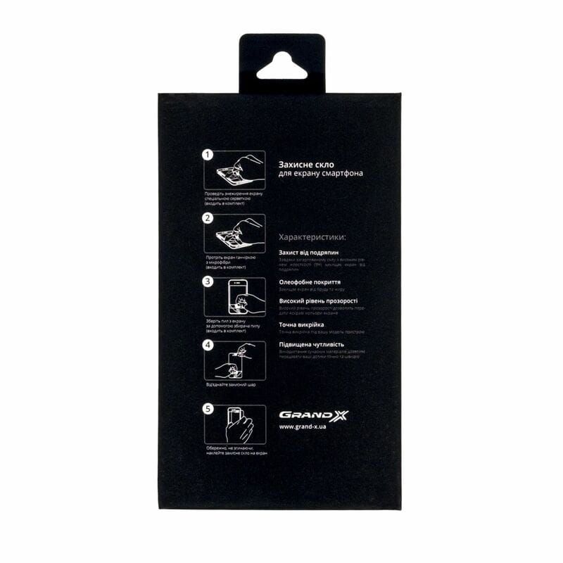 Скло Grand-X покриває всю поверхню екрану і захистить від зовнішніх впливів таких як подряпини, удари, жир і ін. В склі застосовуються передові технології: олеофобне покриття, гартування скла, закруглені краї скла в горизонтальній площині.