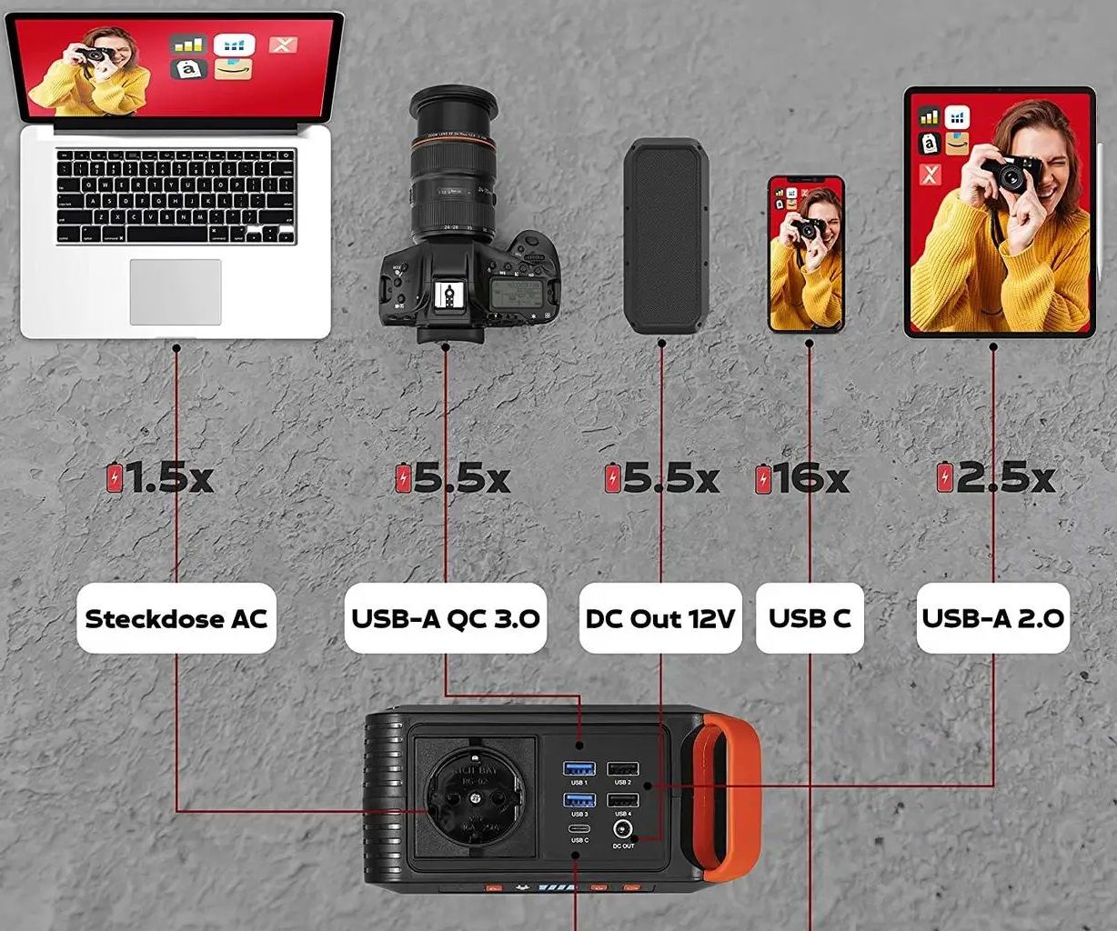 Завдяки потужності 88,8 Вт·год і вихідній потужності 80 Вт (макс. 120 Вт) PPS 100PRO є потужним, практичним джерелом надзвичайної потужності для пригод на природі. Потужний, практичний і надзвичайно легкий цей портативний акумулятор доставить вас куди завгодно: у похід, на відпочинок, в кемпінг тощо. Завдяки семи розеткам можна гнучко заряджати широкий спектр електричних пристроїв, таких як смартфони, світлодіодні ліхтарі, планшети чи динаміки Bluetooth. . Цей пристрій також можна взяти з собою в салон літака і використовувати на борту. Перш ніж сісти в літак, уточніть у вашій авіакомпанії, що це можливо.