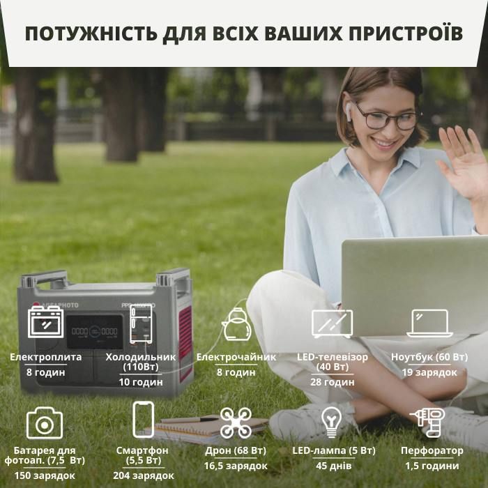 Завдяки ємності 1128 Вт·год і безперервній потужності 1000 Вт наш зовнішній акумулятор ідеально підходить для заміни електричного генератора під час фотосесії або для освітлення фотосесії на відкритому повітрі. Ця міні-електростанція, яку ви можете взяти куди завгодно, може навіть прослужити довго, оскільки вона не розряджається, навіть якщо кілька пристроїв підключено одночасно.