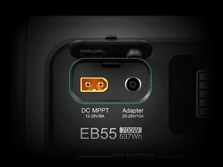 З 200Вт змінного струму + 200Вт фотоелектричного сонячного входу, EB55 приймає до 400Вт вхідної потужності, що дозволяє повністю зарядитися менш ніж за 2 години.