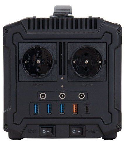 TRAVELBOX 500+ має продуману панель підключень: 2 розетки 230 В (чиста синусоїда) для приладів, кілька USB-портів і низьковольтних виходів для 12 В пристроїв. Вбудований автоматичний захист, робота в діапазоні температур від -15 °C до +60 °C роблять пристрій придатним як для домашнього резервного живлення, так і для кемпінгу, майстерні або виїзного заходу.