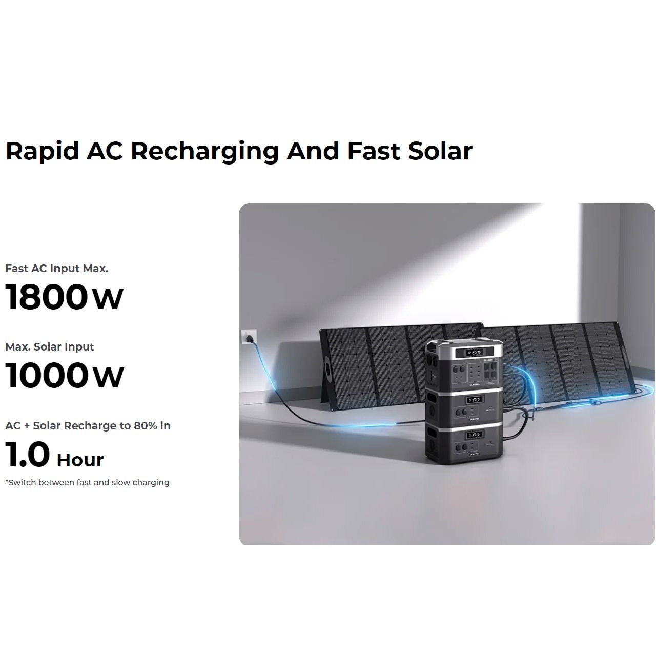 BP2000 Pro заряджається від 0 до 80% за 1.5 години з максимальною потужністю 1800 Вт. Вхід змінного струму або подвійне заряджання PV1000W + AC1500W до 80% всього за 1 годину, що дозволить вам почати використовувати його знову за короткий час.