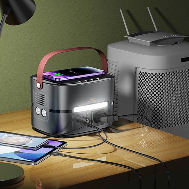 У мобільній електростанції є одна універсальна розетка на 230 В, два повнорозмірні USB-порти, один симетричний USB type С з вихідною потужністю 18 Вт, два DC-виходи 15 В/10 А. До того ж на «маківці» пристрою розташувалася зона для бездротової зарядки гаджетів (10 Вт).