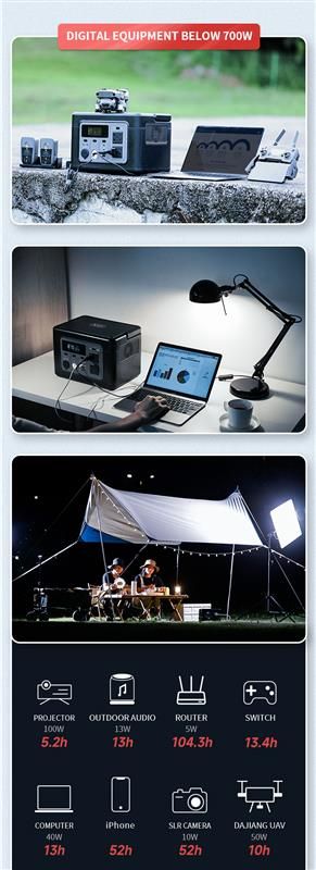 Станція може застосовуватися в багатьох випадках та сферах: у побуті, під час аварійних або планових відключень електроенергії; під час робіт медичної та аварійно-рятувальної служб; виконання ремонтних робіт енергетичного обладнання; ведення прямих трансляцій на відкритому повітрі, організація та проведення вечірок, виступів, міні-концертів; кемпінг та похід у гори; живлення офісної техніки, тощо. Пристрій сумісний з більшістю цифрових приладів і побутової техніки потужністю до 700 Вт.